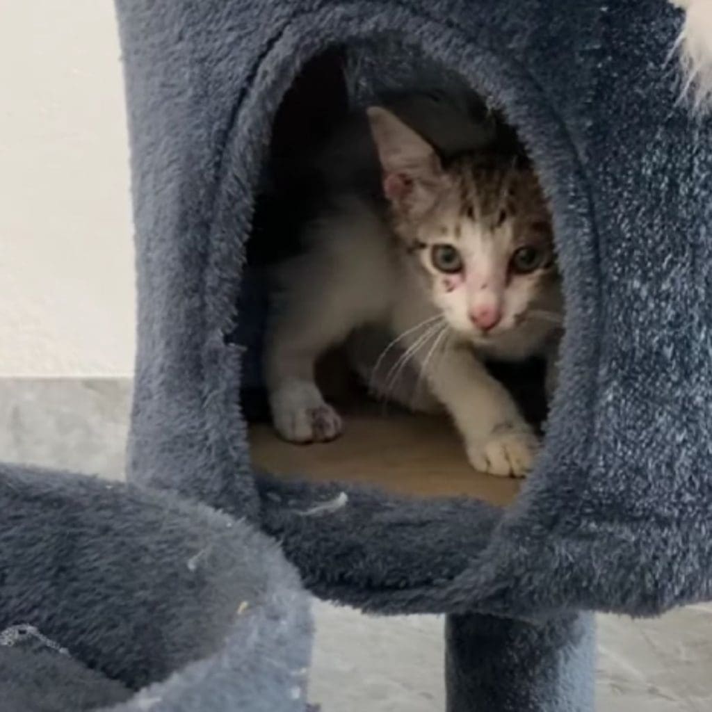 The kitten explored every area he could reach—tiny steps at first, then more confident ones as his strength returned. He discovered a cat tree tall enough to make him feel brave and beds soft enough to make him feel treasured.