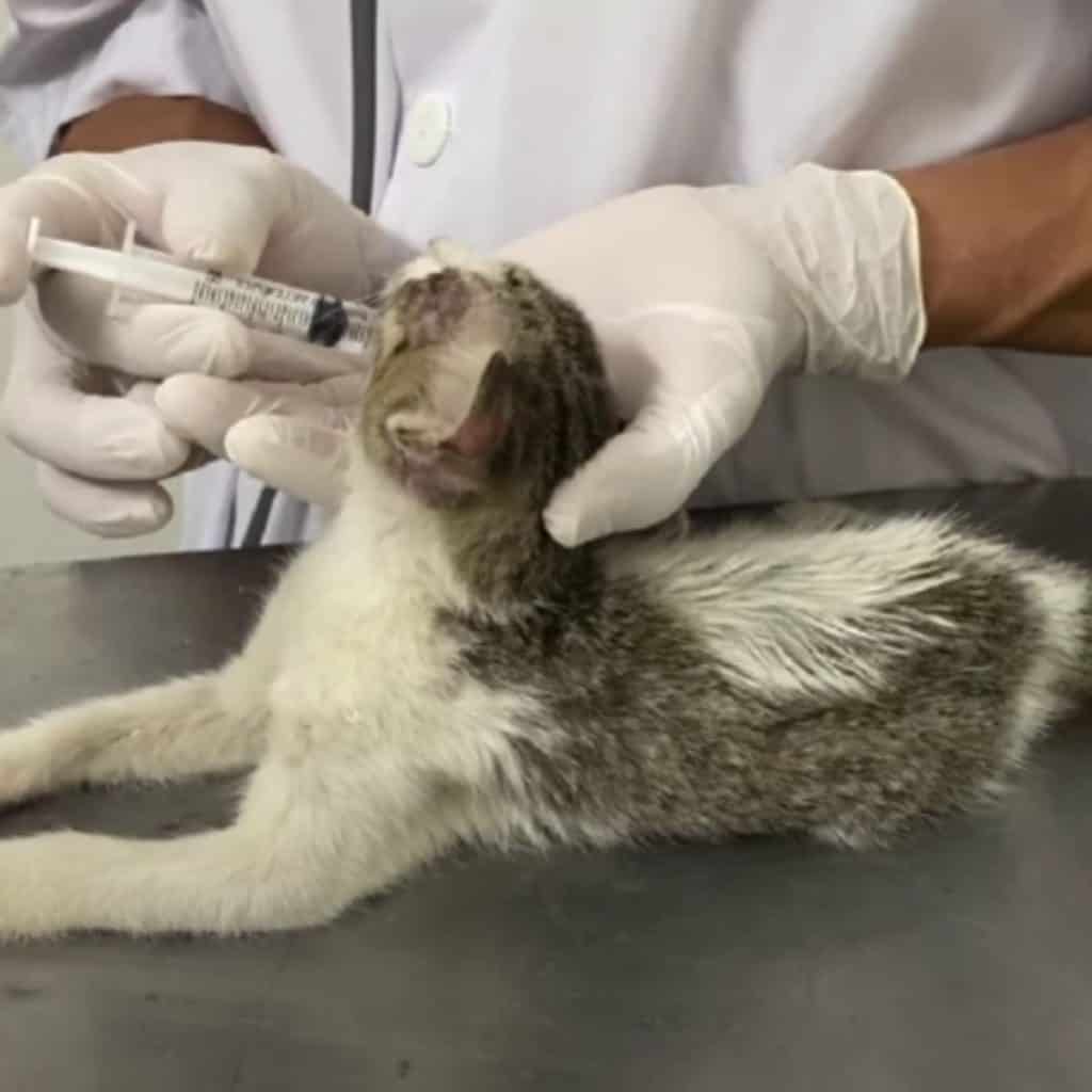 Medication followed, along with food delivered through gentle hands. With each hour that passed, the kitten’s tiny frame looked a bit stronger, as though hope itself was filling him up.