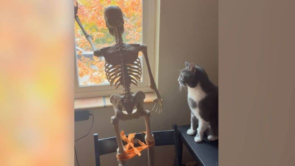 And in that home, Halloween never ends, because one kitten decided a spooky skeleton wasn’t scary at all.