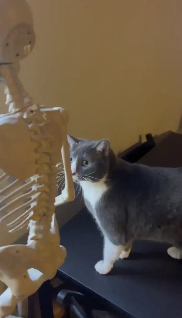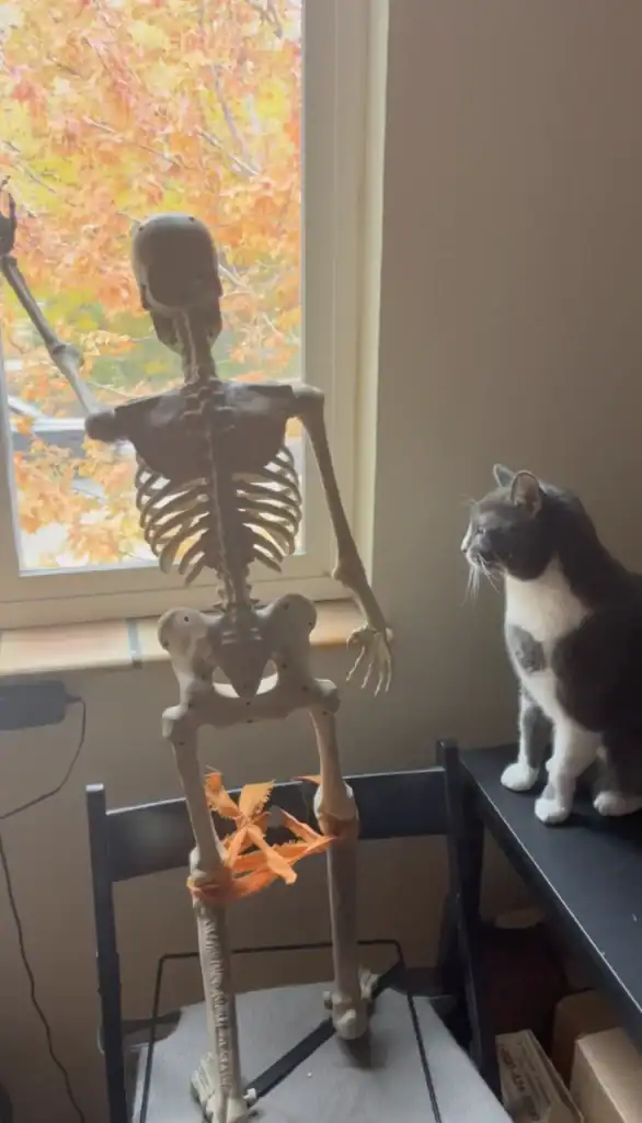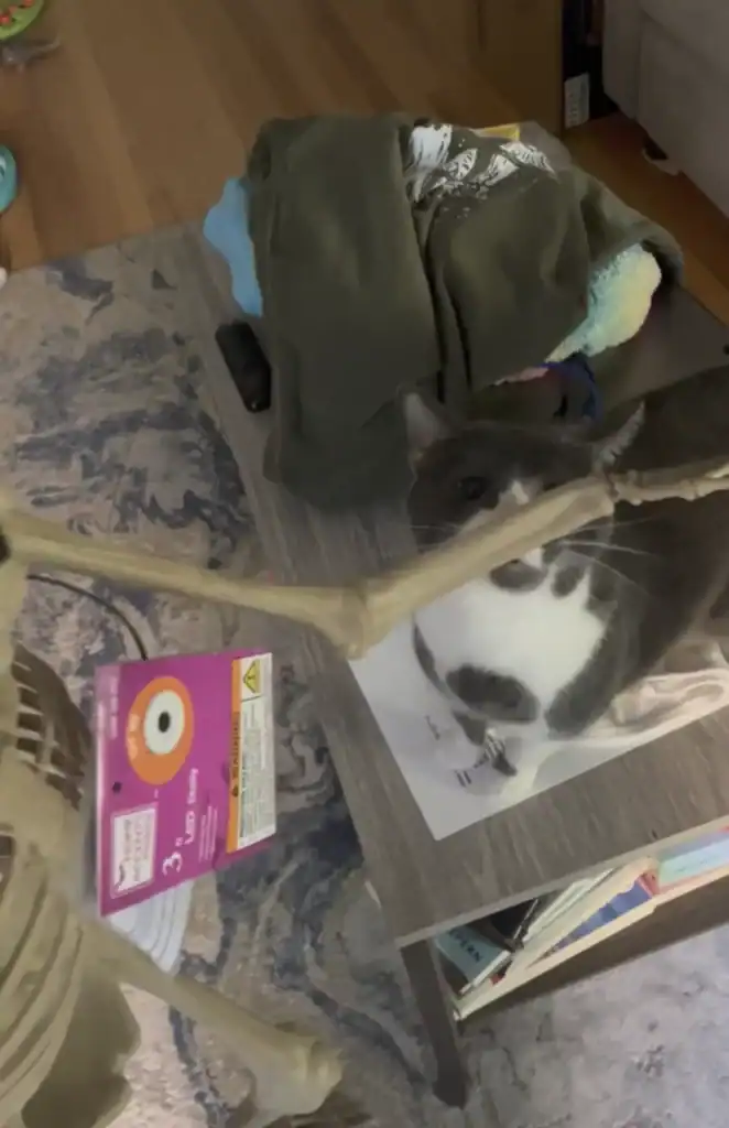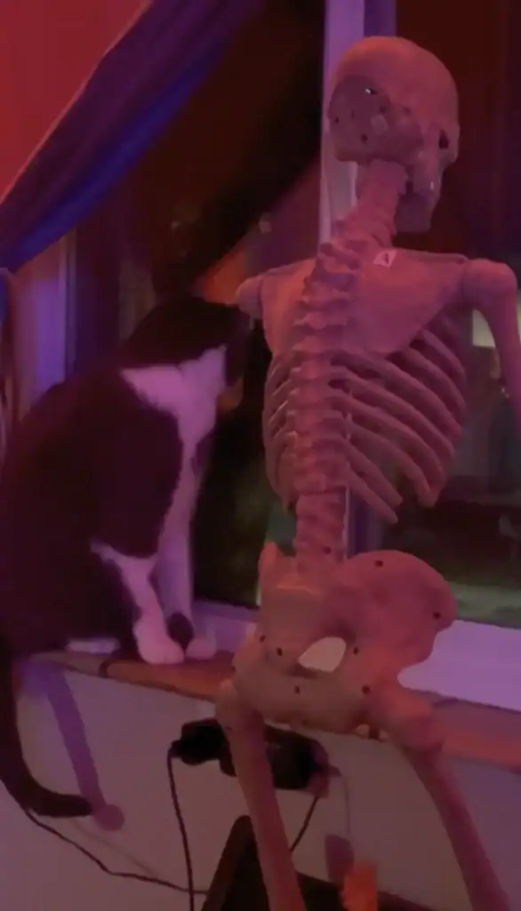 Pip even secured the skeleton on a stand so it wouldn’t fall whenever Gravy rubbed against it.