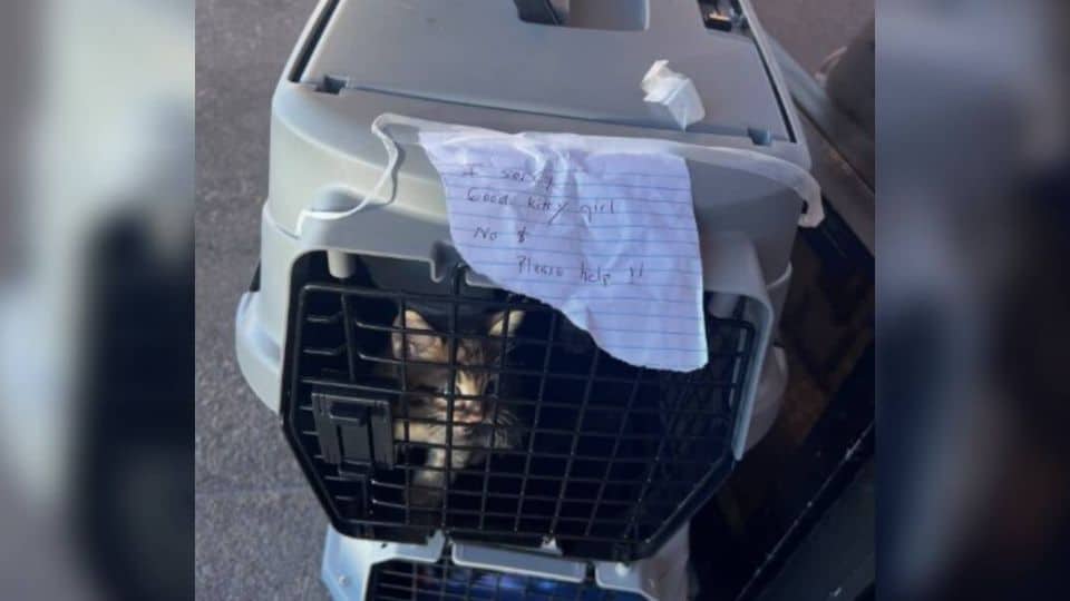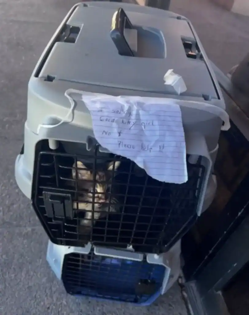 A torn piece of notebook paper was taped to one of the carriers. In shaky handwriting, it read: “I sorry. Good kitty girl. No $. Please help.”