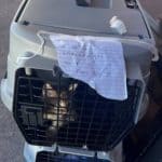 A torn piece of notebook paper was taped to one of the carriers. In shaky handwriting, it read: “I sorry. Good kitty girl. No $. Please help.”