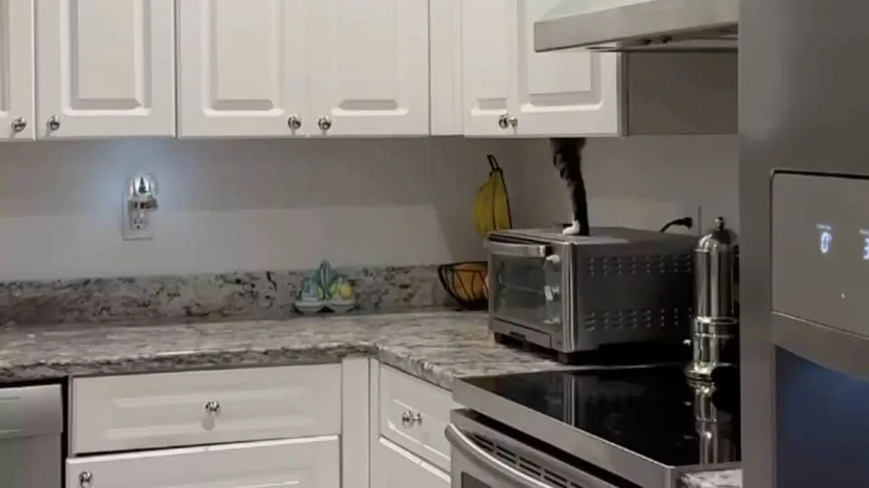 Within moments, the clever cat landed gracefully on the toaster oven, clutching his newest treasure: a sealed bag of Funyuns.