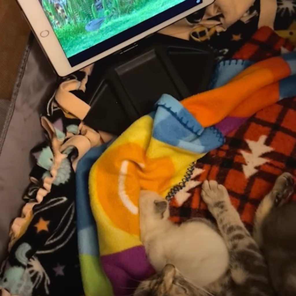 Their other cats, Brandy and Ripper, kept sniffing Tree Kitty.