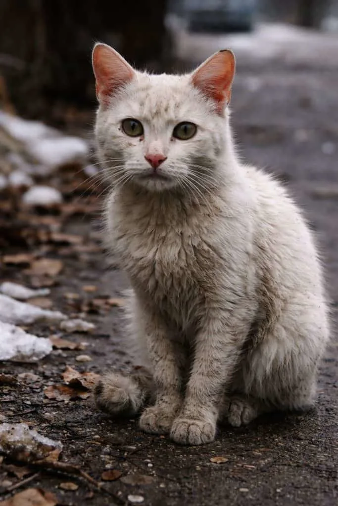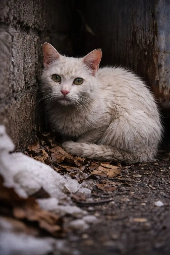 The white cat sniffed the air, shaking from the cold.