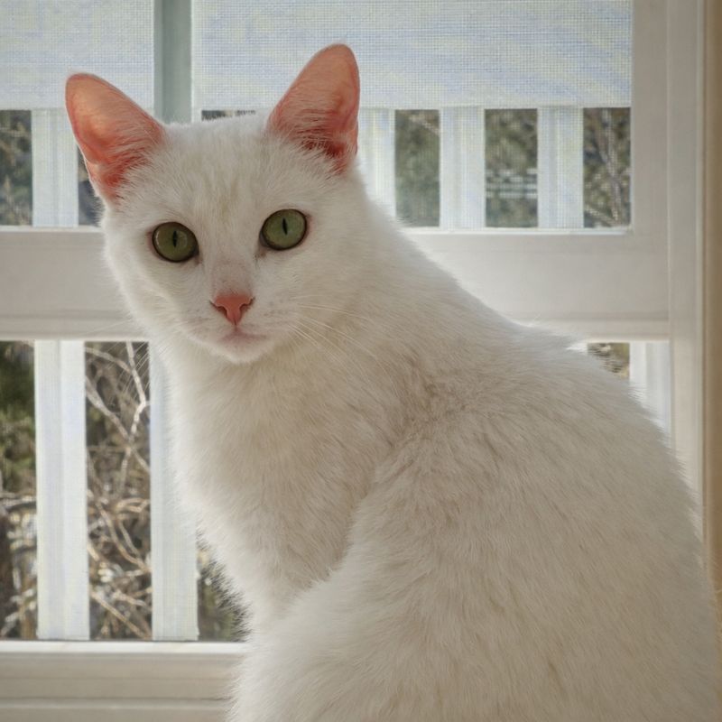 The white cat blinked slowly, calm and kind.