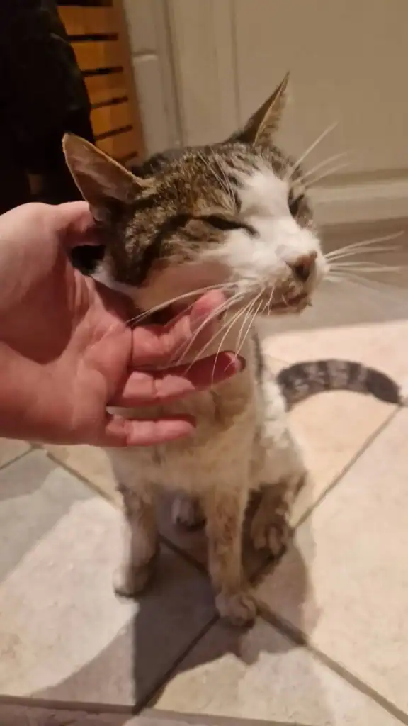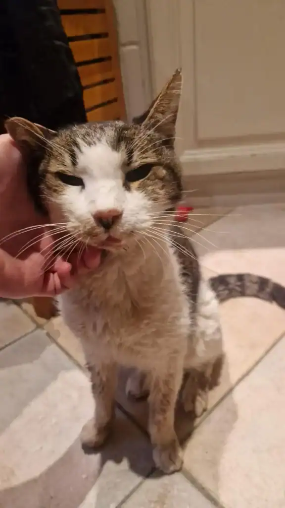 The cat barely had the strength to stand, and yet, when they gently lifted him, he leaned into their touch as if remembering what kindness felt like.