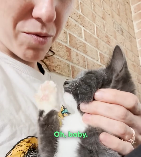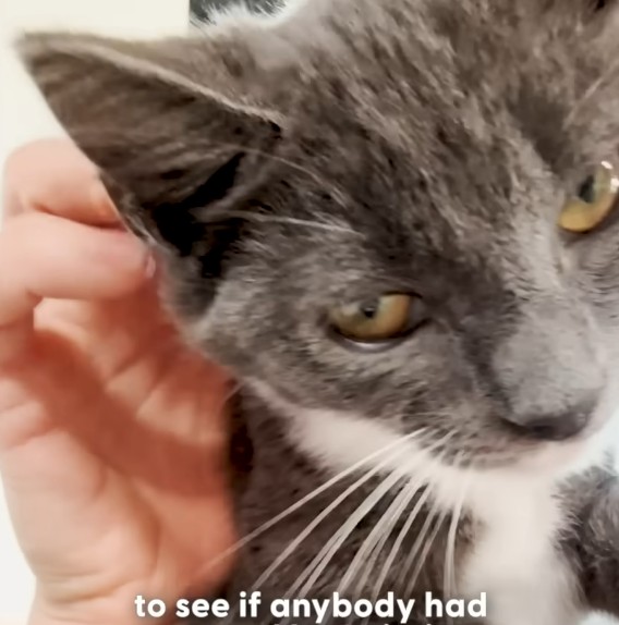 The kitten meowed in panic, then immediately calmed when the hand touched her head.