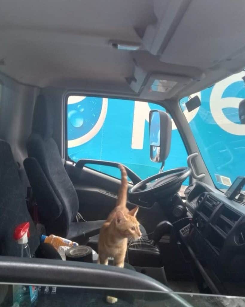 When the driver opened the door a few minutes later, he froze at the sight of the tiny ginger stowaway staring up with wide, pleading eyes.