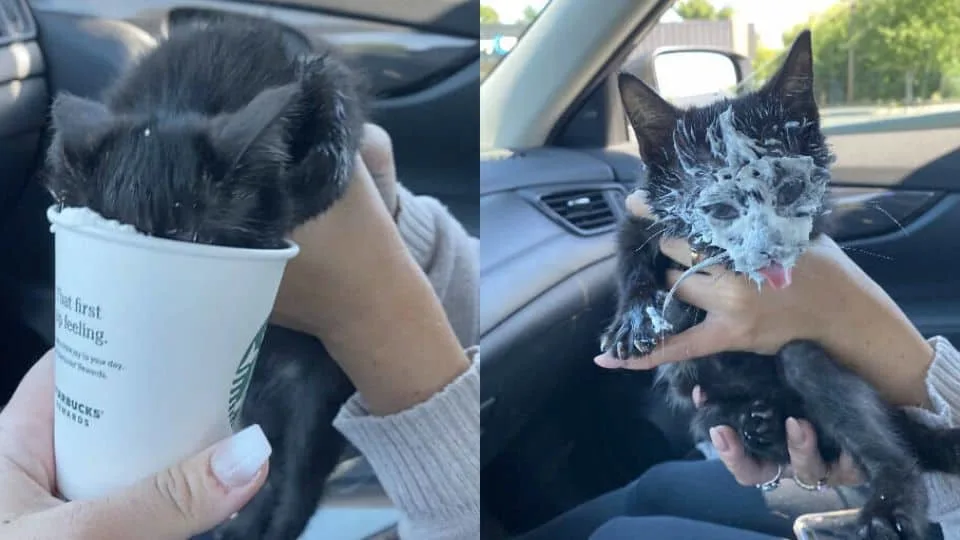 The tiny kitten didn’t care about appearances—she was far too busy enjoying every second. Cream smeared across her fur, Meredith pawed at the cup and tried to pull it back when her rescuers decided she’d had enough.
