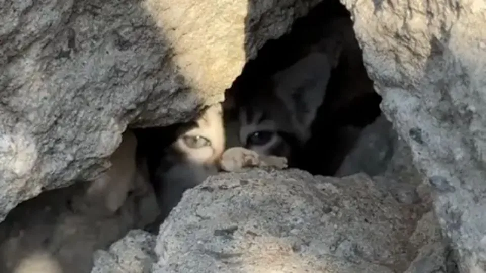 Together, they extended the food into the rubble. Slowly, the first kitten emerged, trembling but hungry enough to take a chance.