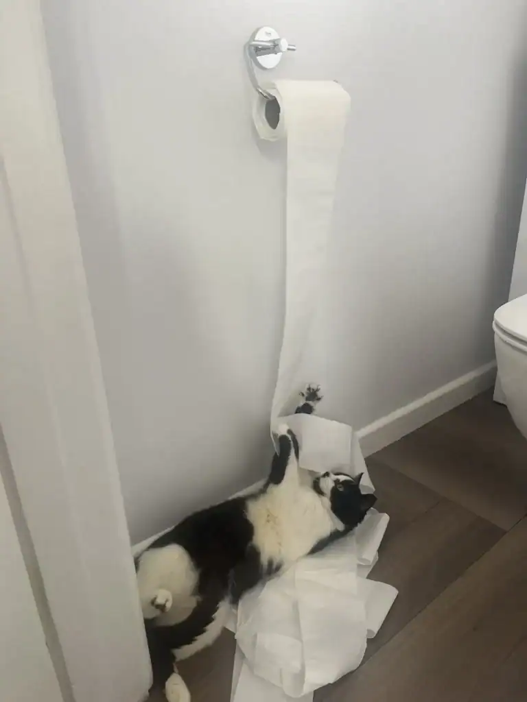 His favorite target? Anything filled with water. Bowls became swimming pools. Floors became puddles. Every splash sent Fiona running for another towel.