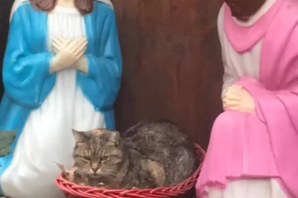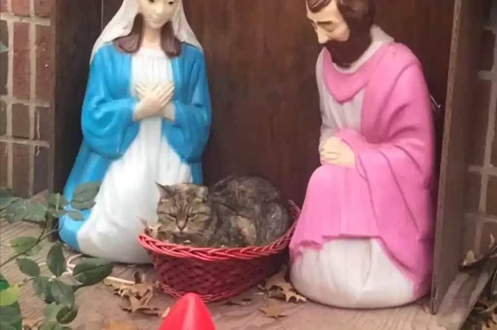 The sight was so bizarre it felt like a painting come to life. The solemn figurines around him — the shepherds, the animals, even the baby Jesus — seemed to bow before this unbothered feline.