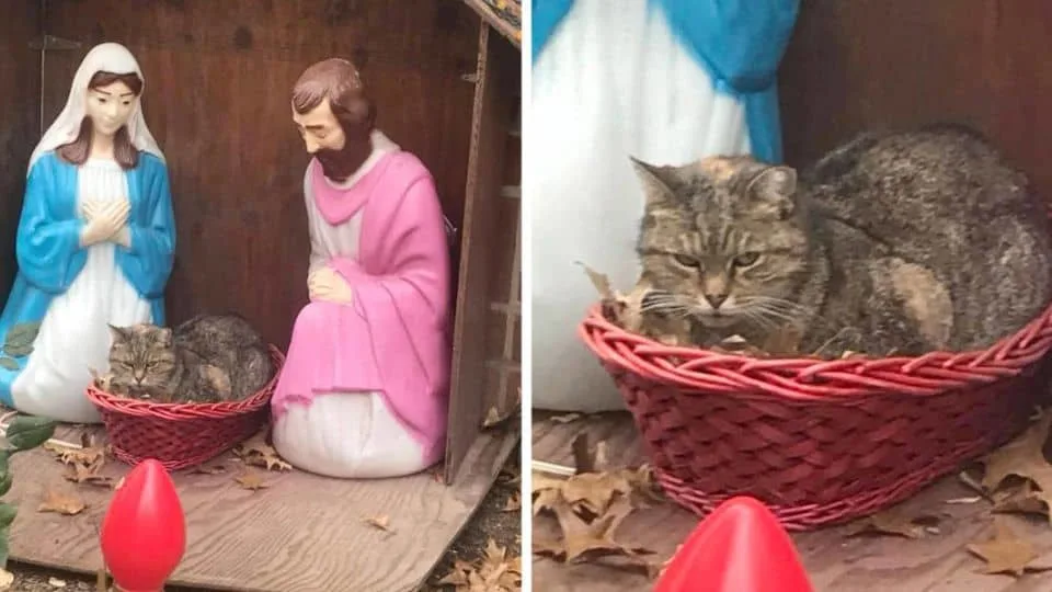 The sight was so bizarre it felt like a painting come to life. The solemn figurines around him — the shepherds, the animals, even the baby Jesus — seemed to bow before this unbothered feline.