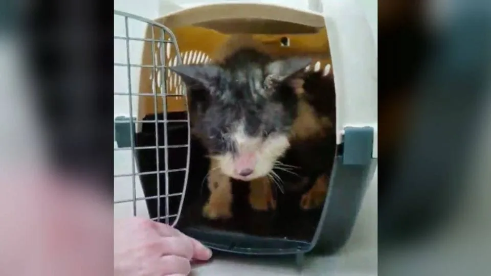 The small black-and-white cat had spent nearly two years trapped inside a carrier, surviving in silence. His body was little more than bones, his fur patchy, and his eyes swollen shut from mange.