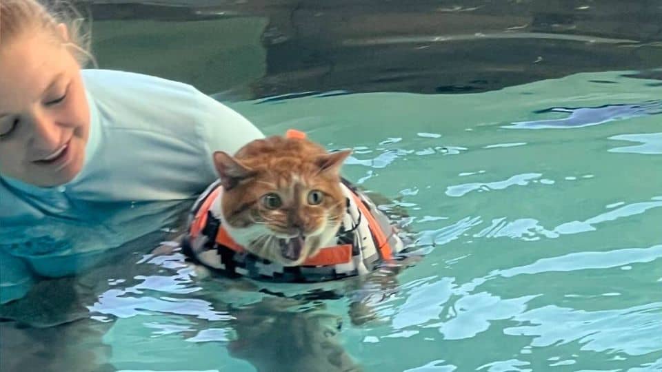 Today, Ty is far from the frightened, overweight cat who first waddled into the humane society. With each water session, he grows lighter, stronger, and more mobile.