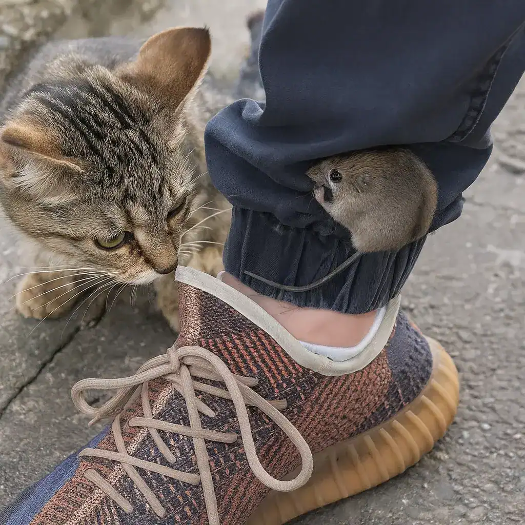 Just a few feet away, a cat crouched low, tail flicking in anticipation. Its eyes were locked on a trembling little mouse, frozen in fear.