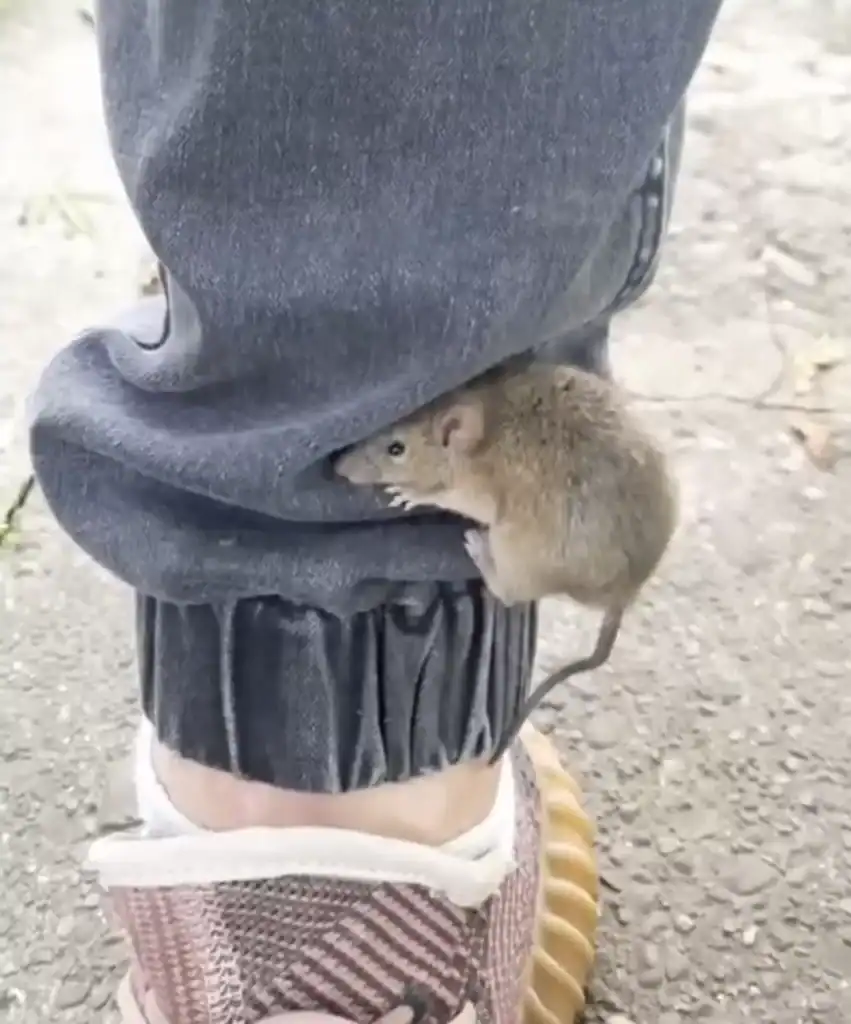 To everyone’s surprise, the little mouse landed right on Antony’s leg, gripping his pants in pure desperation.