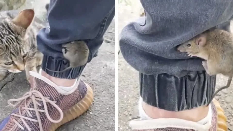 The moment they approached, the mouse made a split-second decision. Sensing danger on both sides — the stalking cat and the sudden presence of humans — she did the only thing her frightened mind could think of. She leapt.