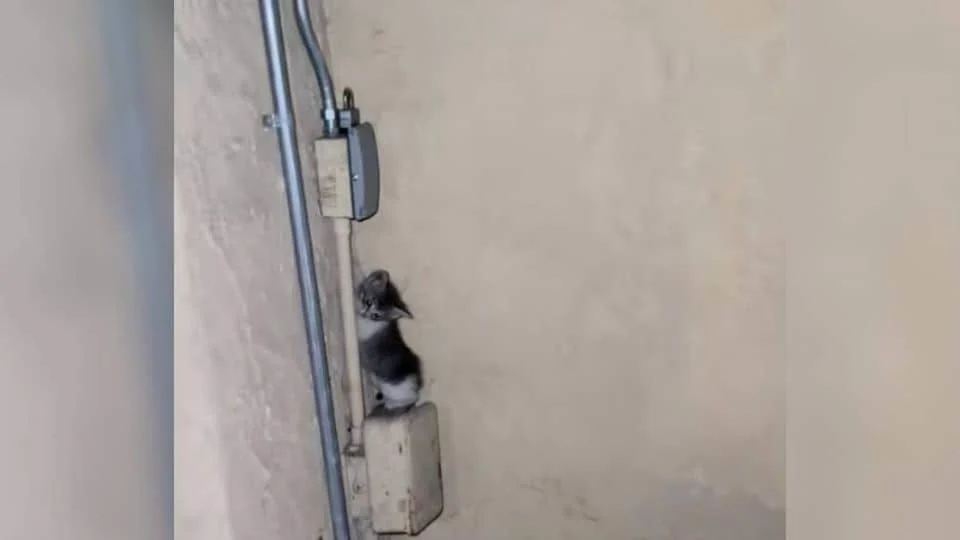 To her amazement, a faint reply came almost instantly. Following the tiny cries, she spotted a shivering kitten clinging to the top of a cold electrical box. The little one was trembling from both fear and the rain, her eyes wide with worry.