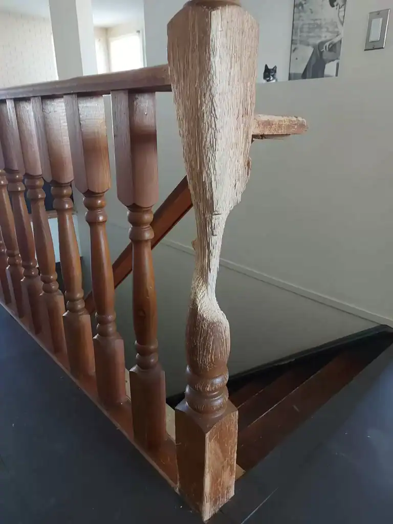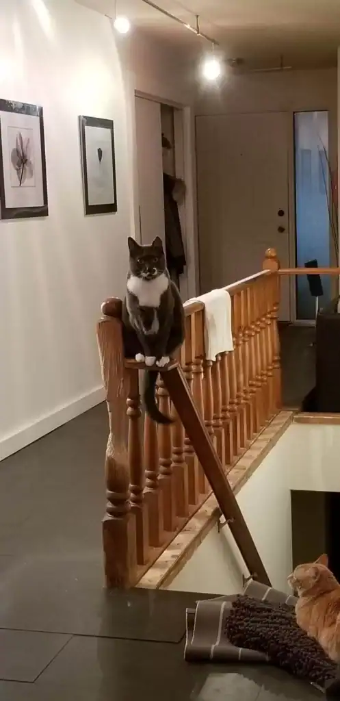In 2012, when Cedric was still young and curious, he discovered the wooden post at the top of the stairs.