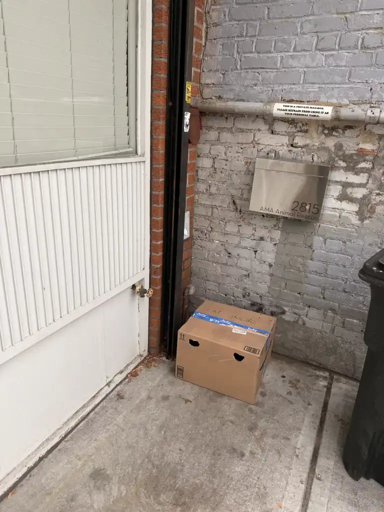 She expected another normal day filled with barking and meows, but something near the trash cans caught her eye — a cardboard box, sealed shut and tucked away as if someone wanted it forgotten.