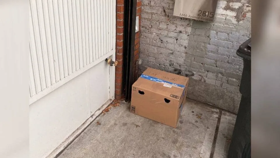 She expected another normal day filled with barking and meows, but something near the trash cans caught her eye — a cardboard box, sealed shut and tucked away as if someone wanted it forgotten.