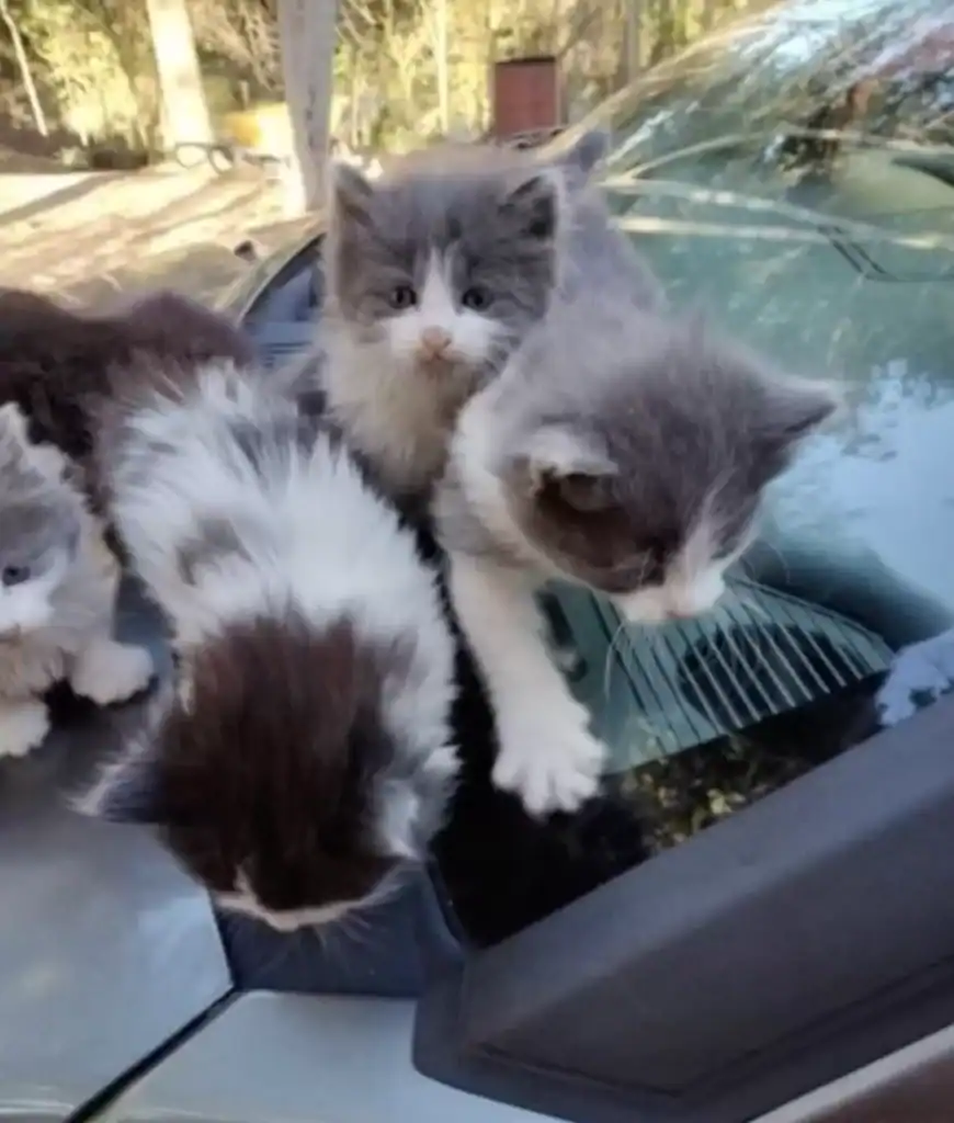 On its hood, five kittens clung tightly to each other, their tiny bodies pressed close for warmth. Their mother hovered nearby, watching the strangers with cautious eyes.