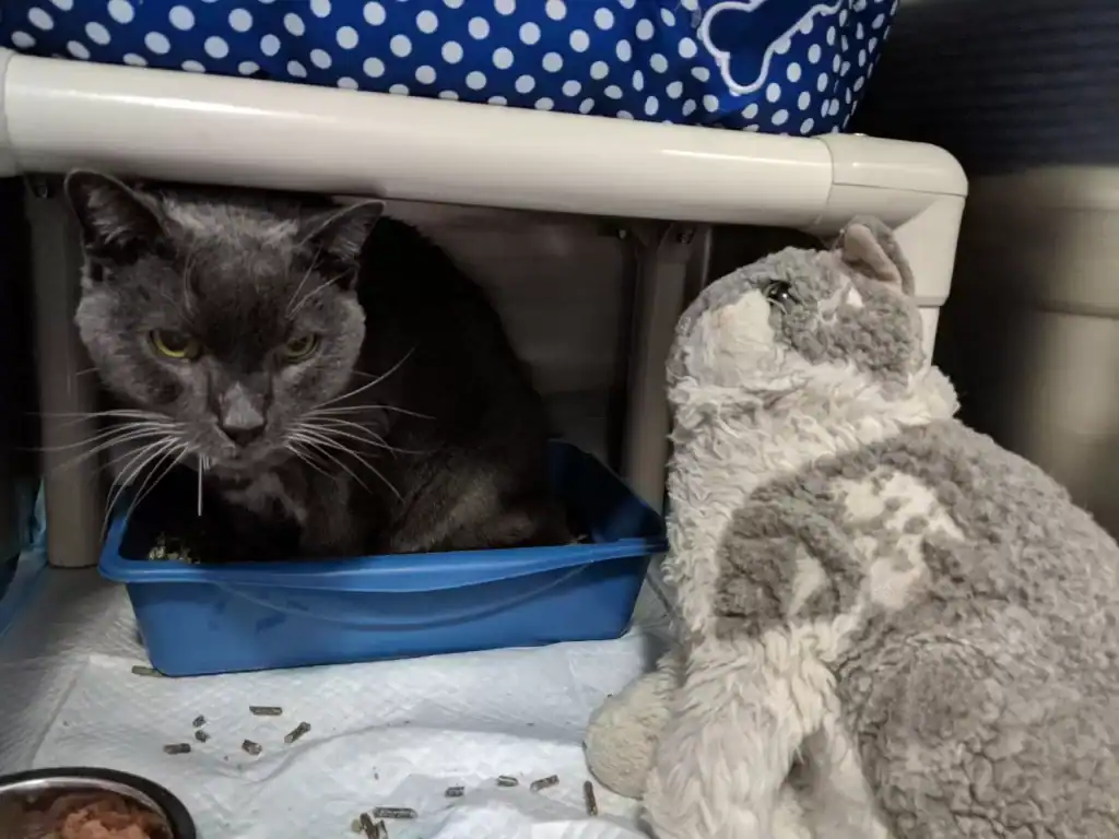 New smells, new voices, and unfamiliar faces surrounded him. Yet inside his kennel, his stuffed cat was there — soft, silent, and still carrying the scent of home.