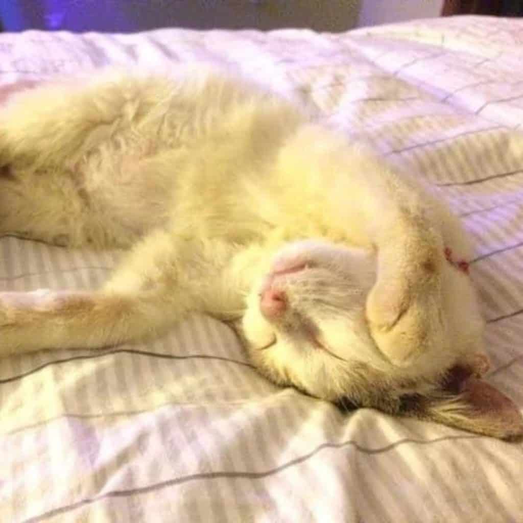 Day by day, Lulu began to change. Warm blankets replaced the cold concrete she had known. Meals came regularly. And slowly, she started to purr — softly at first, as if testing whether it was safe to feel joy again.