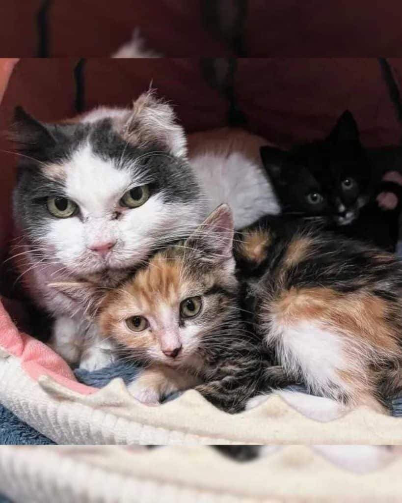 Every night, she curls against the kittens, her small body wrapped in the comfort she fought so long to find.
