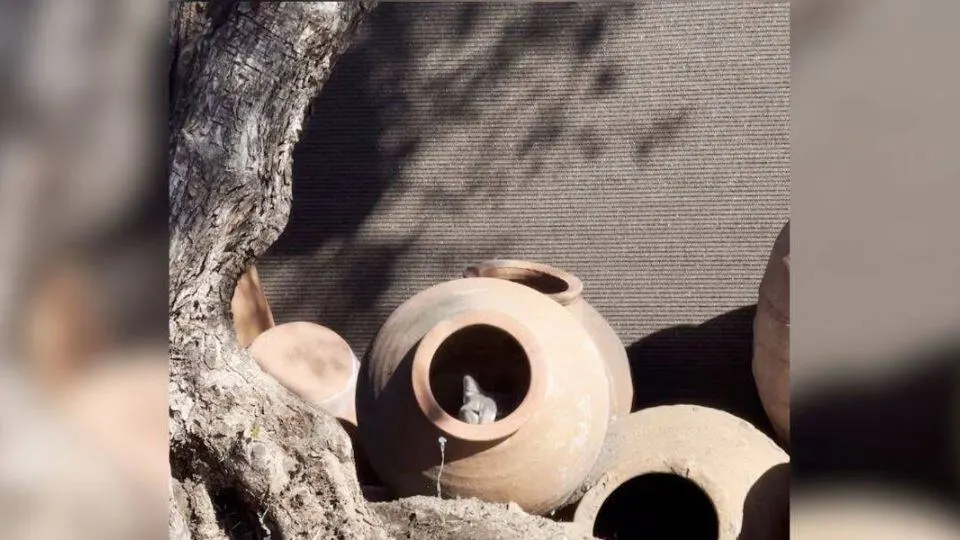 From behind a row of large clay pots, a small, gray face appeared — two curious eyes blinking up at them from inside a pot.