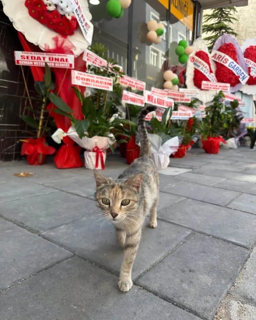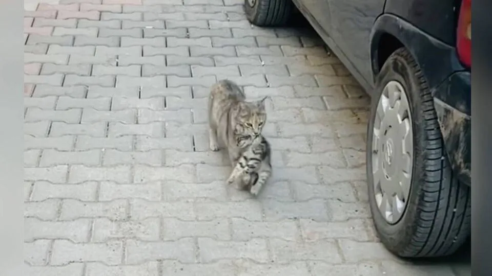 A stray cat appeared at the entrance, not with a meow for food or a search for shelter, but with her tiny kitten clutched tenderly between her teeth.