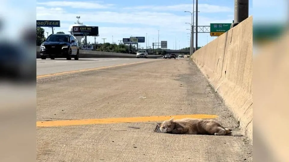 Katie Zelenika was driving from Indiana toward Chicago on a warm afternoon when something unusual caught her eye. In the center of the busy highway, a small orange cat stood frozen on the narrow concrete strip that separated speeding cars.