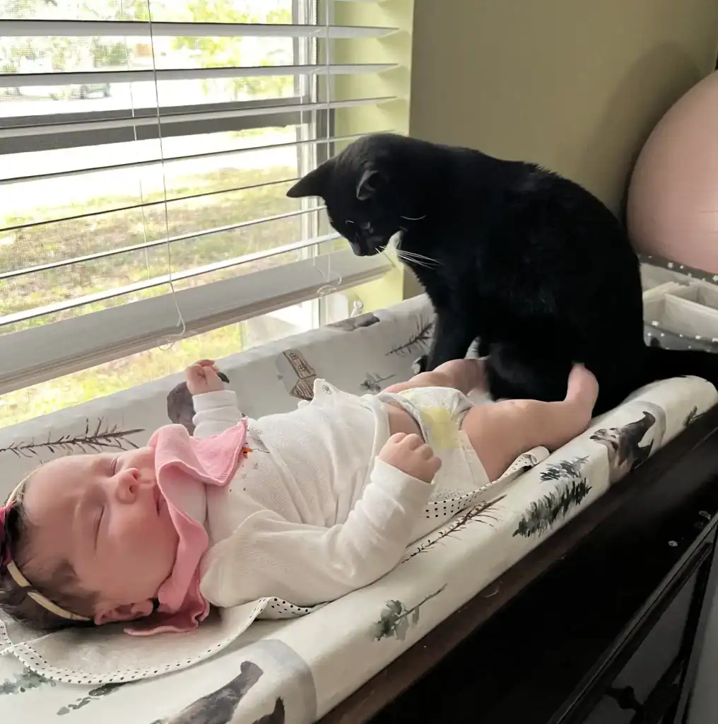 On nights when the cat hasn’t come to bed yet, Zelda grows restless, fussing until her loyal companion appears. Only then does she relax and drift off to sleep.
