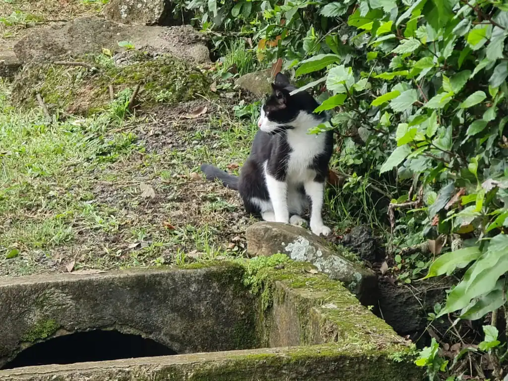 Outside a small grocery store, a black-and-white cat sat quietly on a patch of dirt, her body tucked in as if she were cold and hungry.