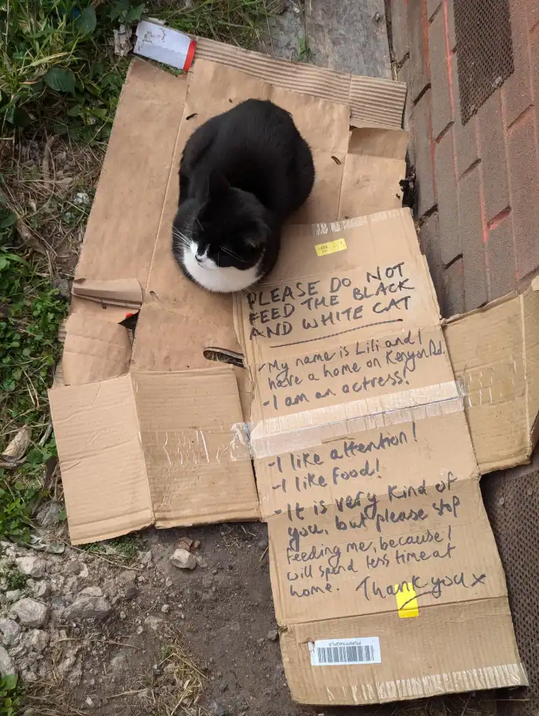 The message politely asked people not to feed her. It even revealed her secret: Lili was an actress — a cat who loved attention and used her charm to win treats from kind strangers.