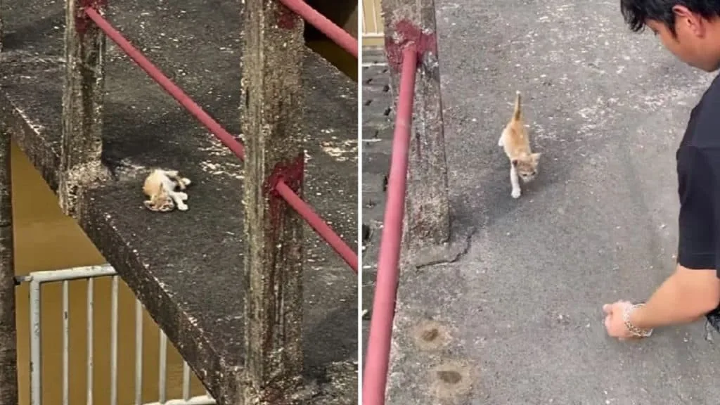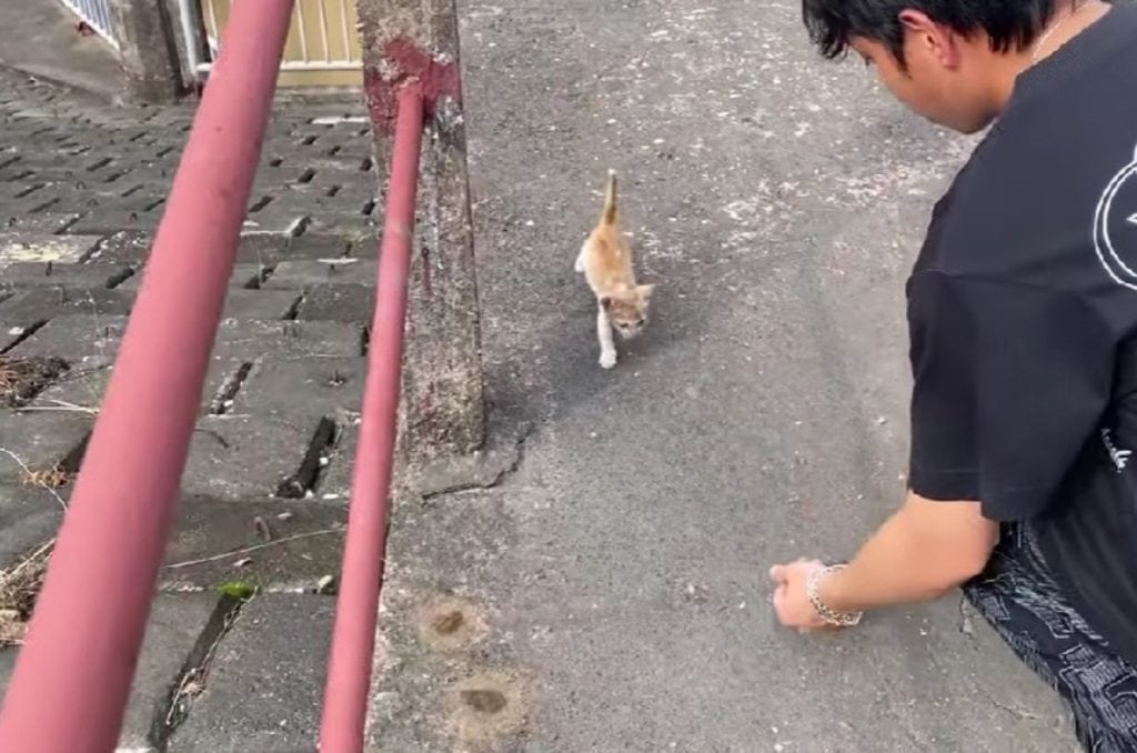 When he followed the sound, he found a tiny kitten standing on shaking legs, crying as if her small heart was shattered from fear.