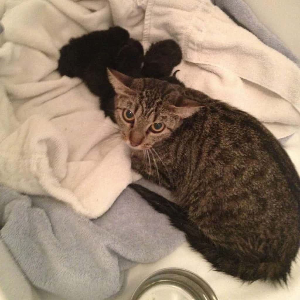 There, lying in a puddle that was almost half an inch deep, was a terrified mother cat.