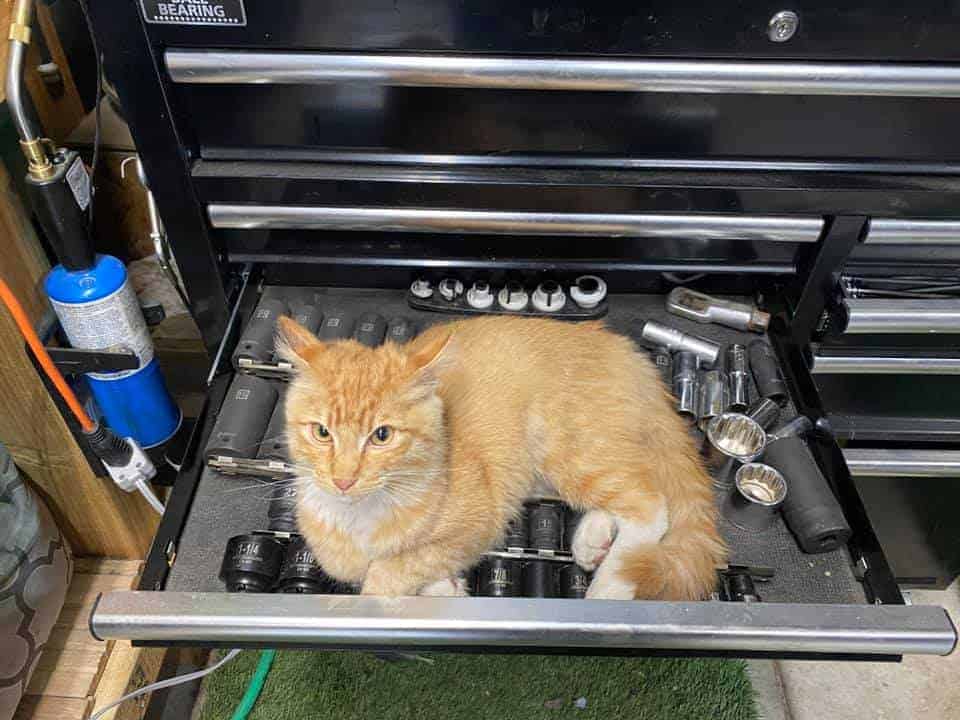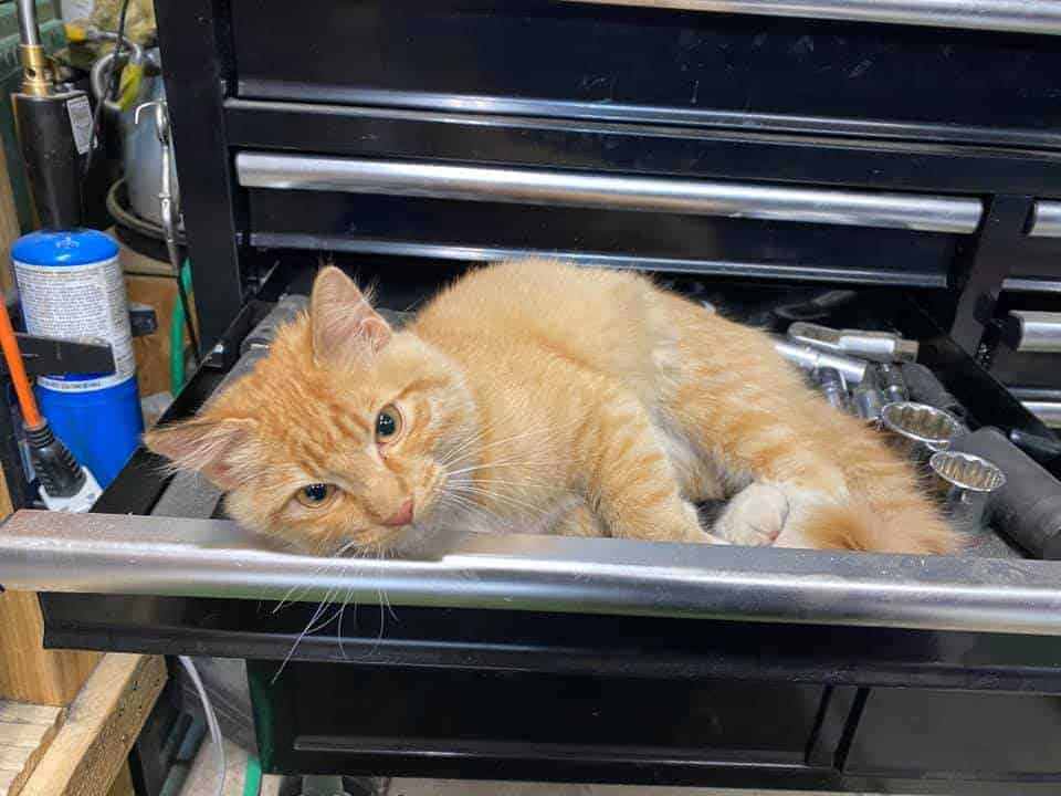 At one point, Steve stepped away to grab another tool and returned to find her curled inside his open toolbox, fast asleep. She looked so peaceful that he didn’t have the heart to move her.