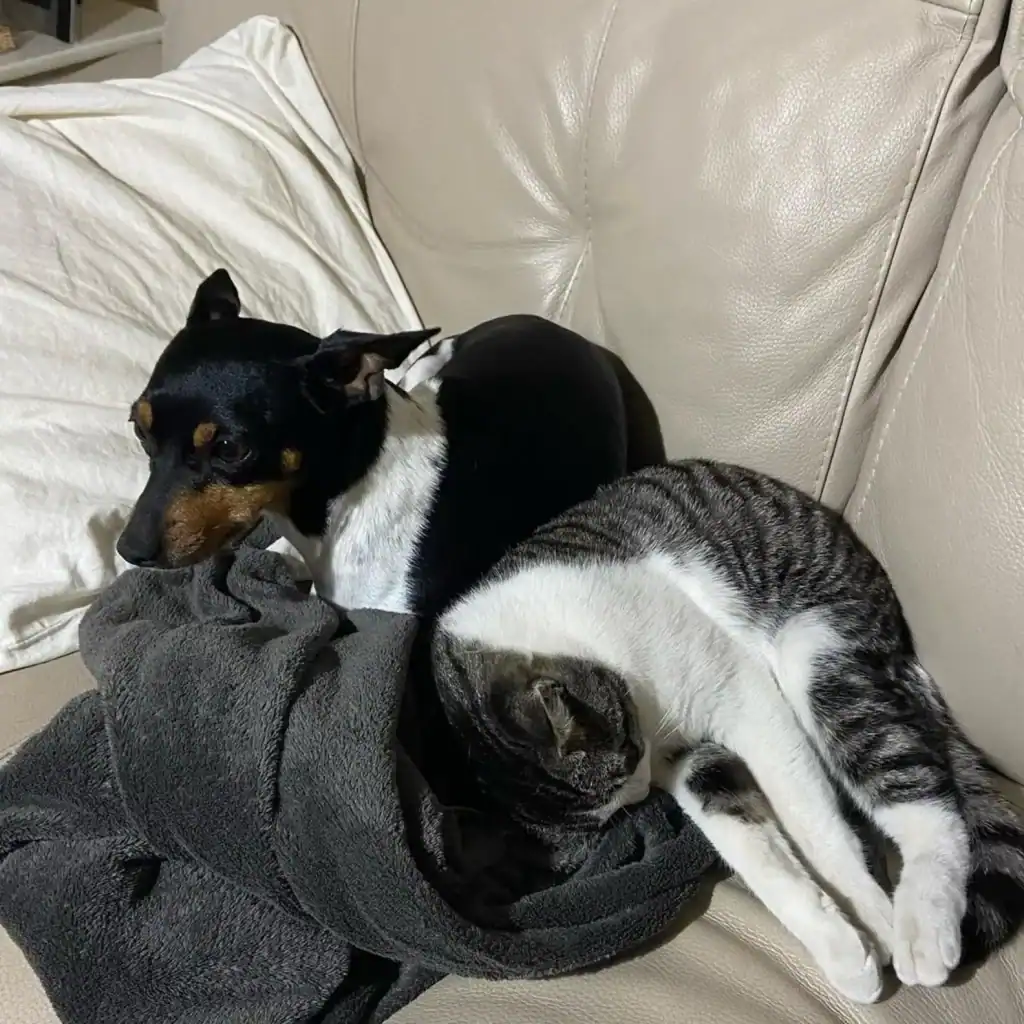 They may battle for their mom’s attention, but when the toys are put away and the day winds down, the two animals can always be found side by side. Sometimes that means curling up together on the couch, other times simply sharing the quiet company of one another.