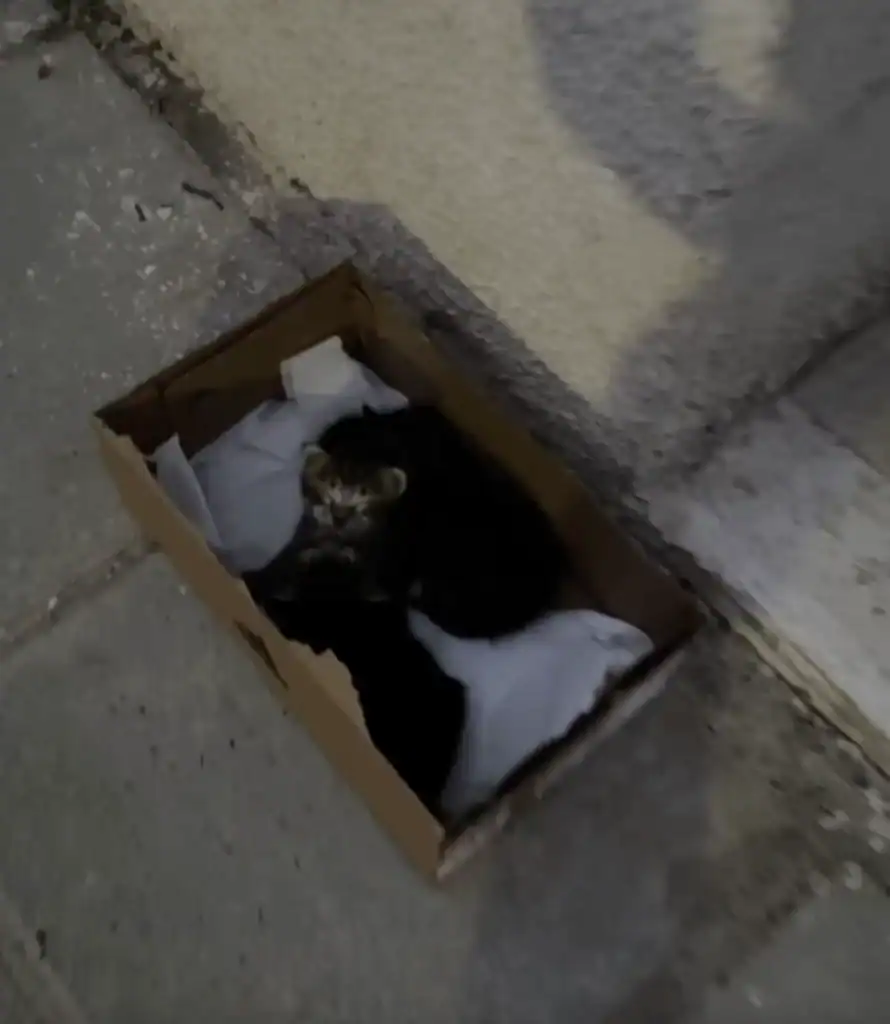 Inside the box were three tiny kittens, their eyes still sealed shut, their soft fur matted and cold. They were no more than a week old — so small that their voices were barely audible.