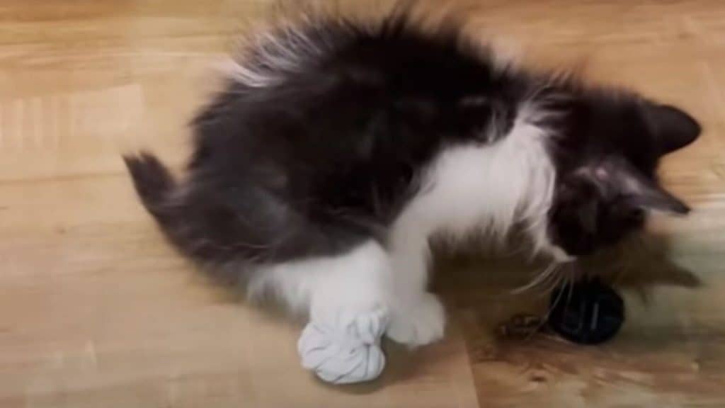 They decided to make special booties, small like doll shoes, but strong enough to guard his little nub.