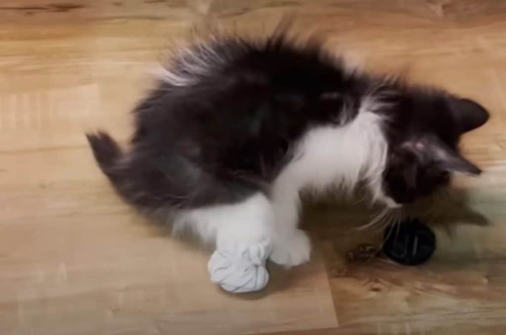 He wiggled, chewed at them, and tried to pull them off with his teeth and tiny front paws.