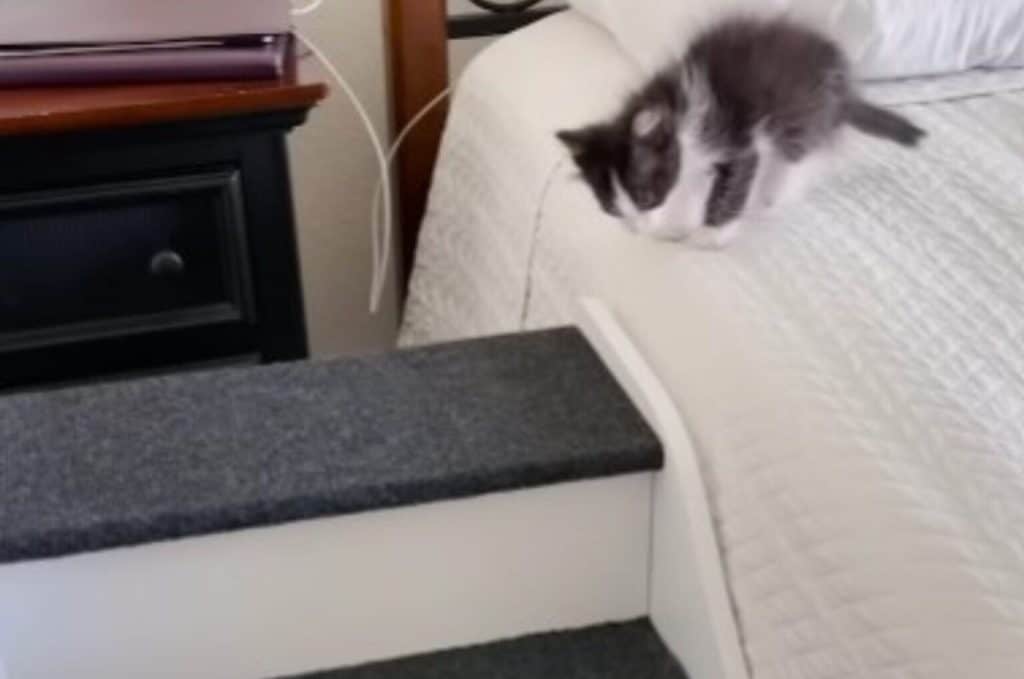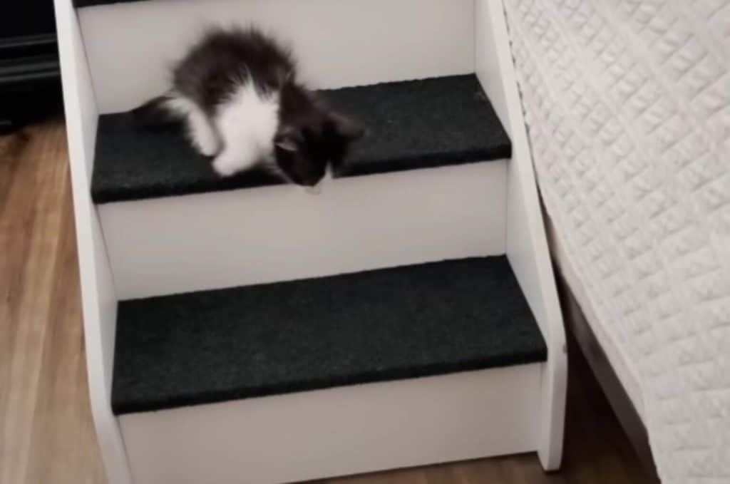 She placed tiny stairs next to the bed, each step covered in soft fabric so it would not hurt him.