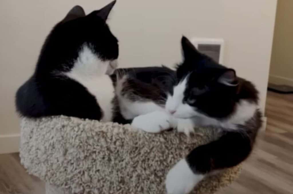 There was a careful sniff, a tiny pause, then two kittens curled together like they had always belonged side by side.