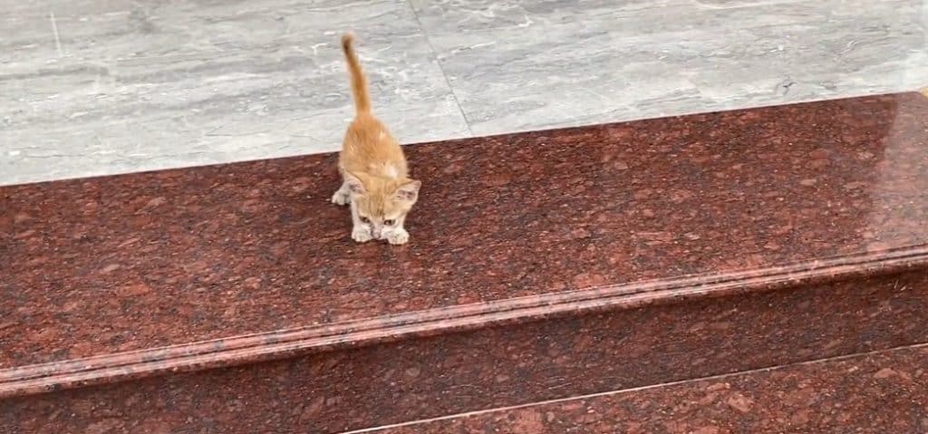 She stepped down carefully, paws touching clean floors, unsure if she was allowed to exist here.