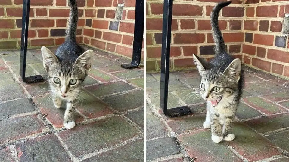 The kitten rushed toward her, tiny paws pressing against her shoes, meowing with all his might.
