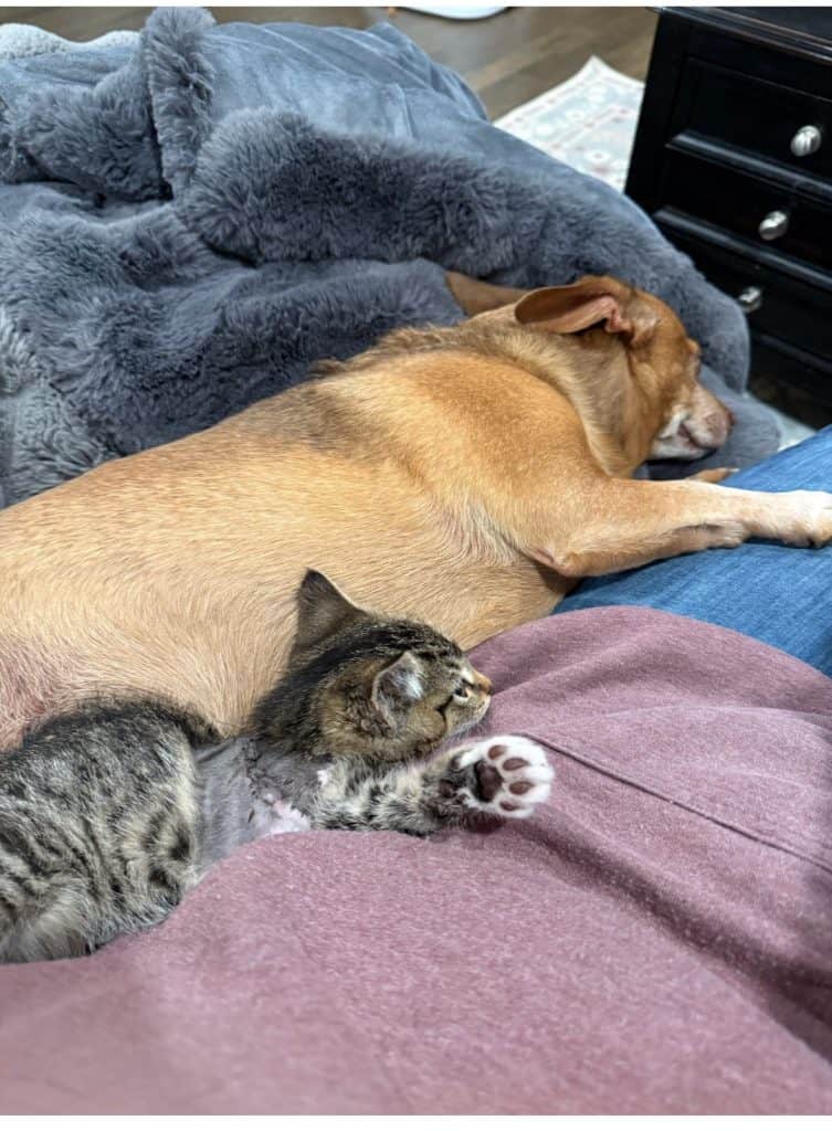 On the drive to safety, the little survivor curled up in one officer’s lap and began to purr. The noise of the highway faded into the background as peace slowly returned to his trembling body.
