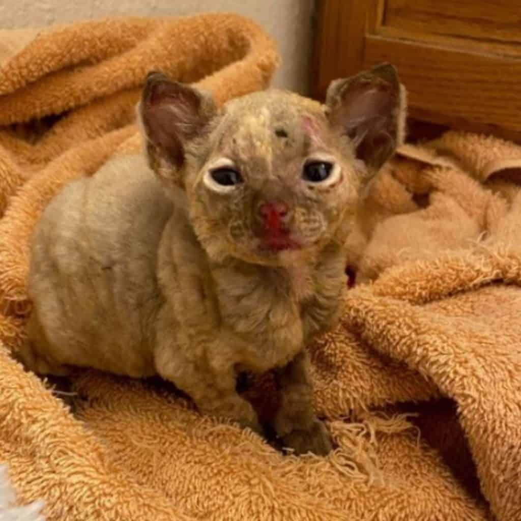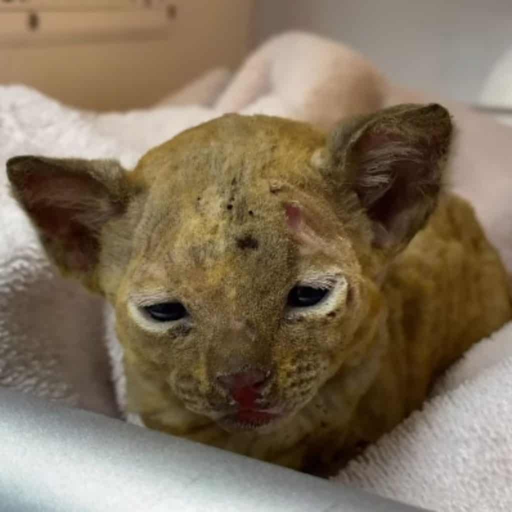 The skin on several areas started peeling, revealing the painful truth of how much she had endured. Her paws were raw, her tail was injured, and her face carried patches where the fur had been completely scorched away.
